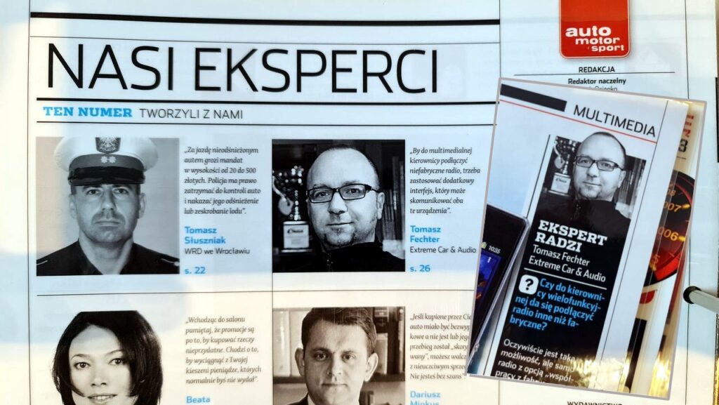 LEFT. Excerpt from Auto Motor und Sport (Poland edition) editorial section “NASI EKSPERCI” (“Our Experts”). The issue lists external experts who co-created editorial content for the magazine. I am shown in the upper-right section, identified as Tomasz Fechter – Extreme Car Audio company. RIGHT. “EXPERT RADZI” expert advises – my opinion / expert advice in the car multimedia section.